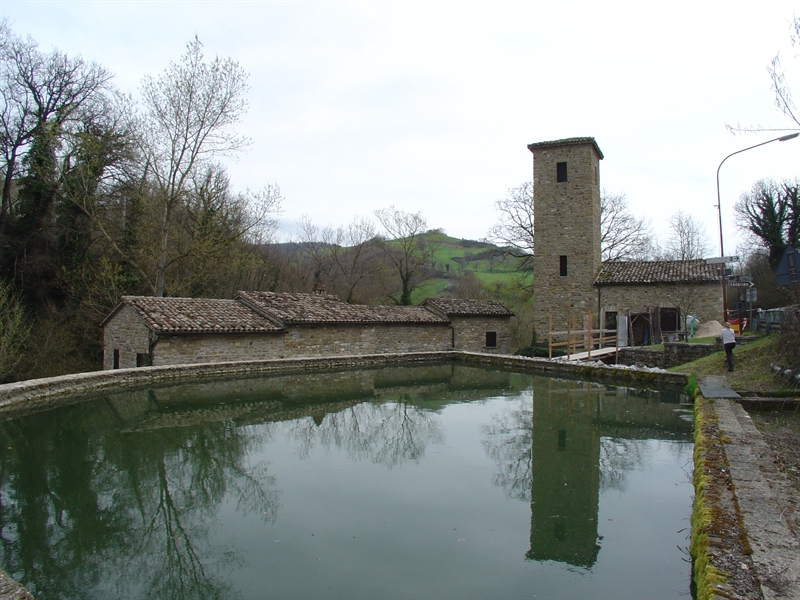 intero bene:La sua esistenza è documentata dal 1658, quando il Cardinal Legato Omodei ne autorizzò la costruzione. Del resto è possibile che già esistesse come struttura al servizio del castello. Dotato di due macine, una per il grano e l'altra per le biade, e di una ingualchiera per la follatura dei panni, restò a lungo un impianto di notevole importanza al quale si veniva a macinare da molte comunità circostanti, anche estere.