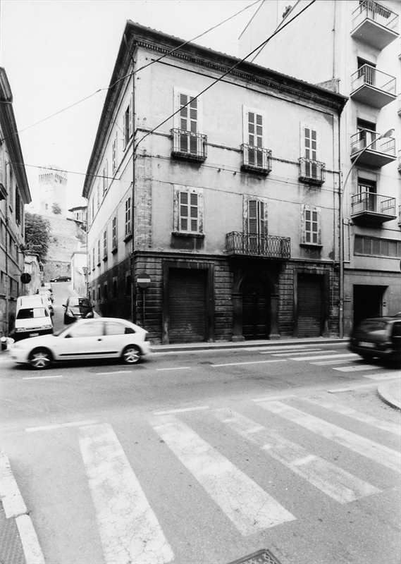 intero bene:Nella mappa catastale del 1873, l`edificio apparteneva a Feliziani Giovanni fu Francesco, ed e' descritto come ' casa con bottega e corte, con dieci stanze al piano terra, sette al primo piano e sei al secondo'.