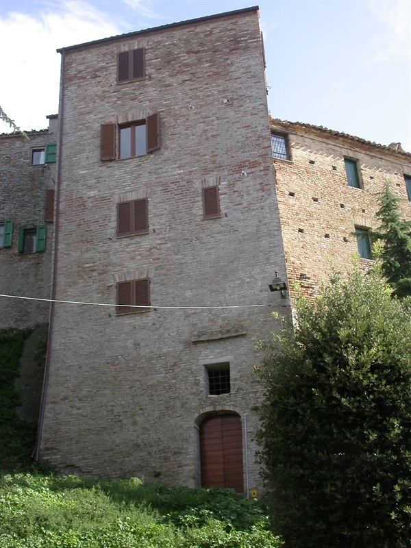 intero bene:La costruzione della torre Ovest inserita nella cinta muraria Sud-Ovest con alta scarpa in laterizio, feritoie e porta d'accesso alla base risale al sec. XV. La copertura a capanna e' posteriore cosi' come l'utilizzo ad abitazione.