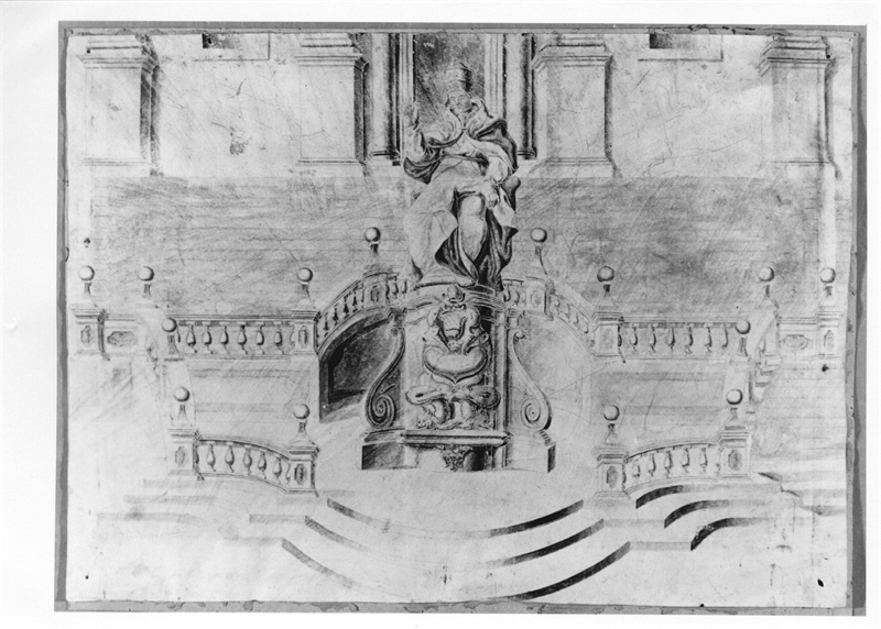 Il disegno riproduce la sistemazione della zona antistante la chiesa di S. Domenico. Della statua, che ancora oggi domina la scalea antistante la chiesa di S. Domenico, è noto che fu realizzata a Roma da Agostino Cornacchini fra il 1735 e il 1737, destinata alla cappella Orsini in S. Giovanni in Laterano. Per onorare la munificenza del Papa verso Ancona, la statua giunse qui via mare nel 1738. La tradizione riferisce che la progettazione e la sistemazione del basamento sono opera di Bartoli; l'esecuzione dello scalpellino G.B Albertini.