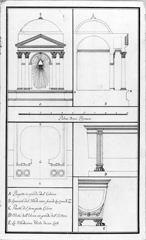 prospetto sezione e pianta di un tabernacolo e prospetto di una mensa d'altare