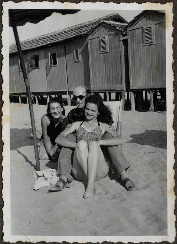 Ritratto di due ragazze e un uomo seduti sulla spiaggia di uno stabilimento balneare