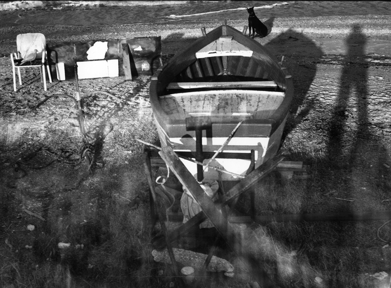 barca cane sedia sulla spiaggia e l'ombra di un uomo