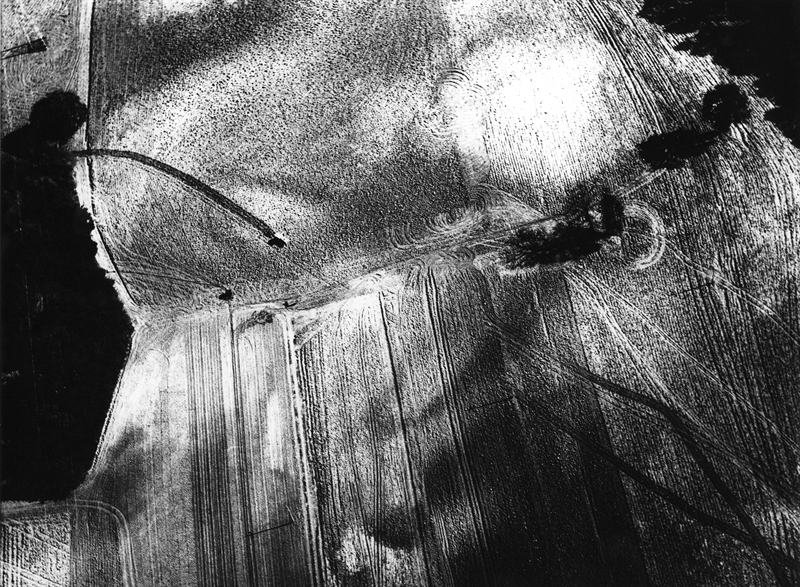 Paesaggio aereo - campi arati - alberi - trattore - segni
