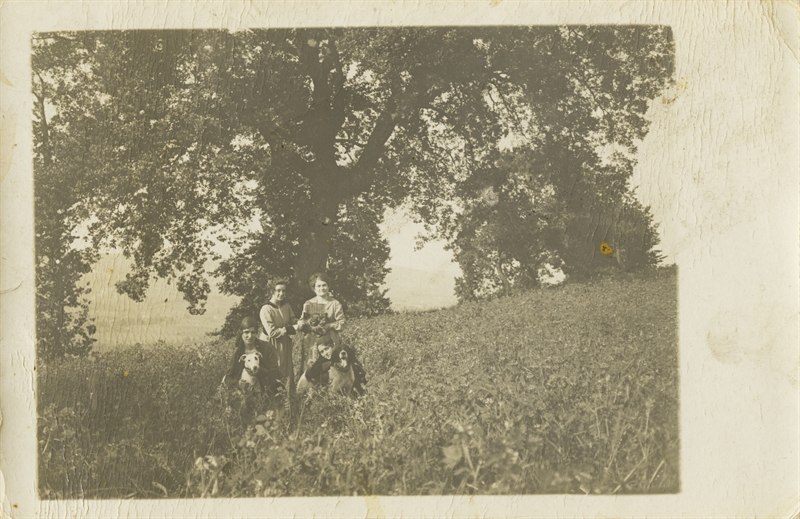 Ritratti femminili di quattro donne e tre cani. Tita Valori, in piedi, è riconoscibile sulla destra