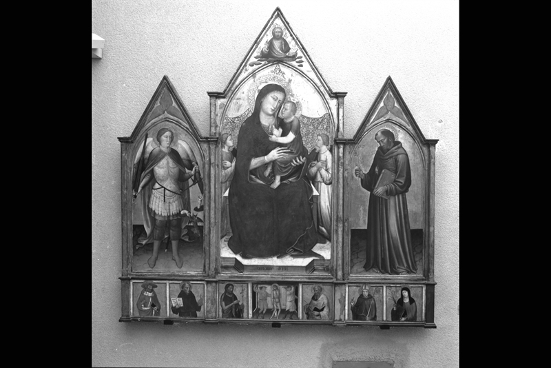 Madonna con Bambino, San Michele Arcangelo, San Francesco, San Girolamo, Beato Sante, San Giovanni Battista, Cristo flagellato, San Giacomo, San Ludovico e Santa Chiara