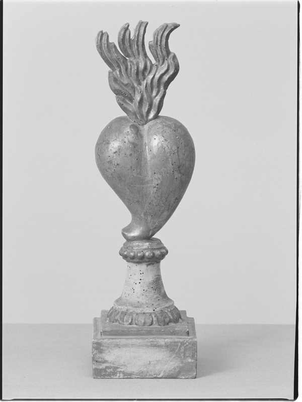 Su basamento quadro, piedistallo troncoconico intagliato con motivo a baccelli nel bordo inferiore e a perle in quello superiore. Su di esso poggia la punta del cuore con fiamma apicale.