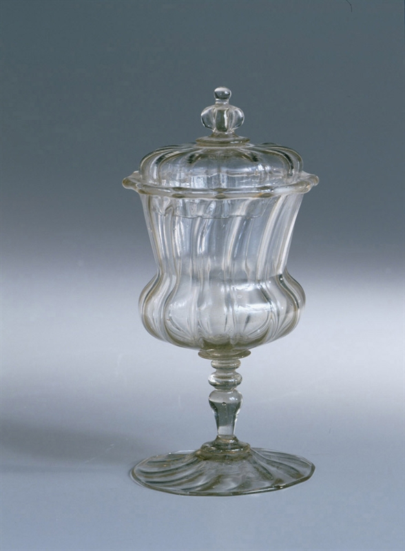 Calice in vetro incolore poggiante su piede conico percorso da rigature e breve stelo a balaustro sormontato da nodi. Coppa costolata a corpo sferico schiacciato e alto collo svasato completata da un coperchio costolato a cupola schiacciata con pomello quadripetalo sormontato da un globo.
