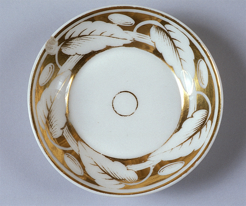 Piattino con tesa decorata da motivi a foglia su fondo oro e cavetto liscio con al centro un cerchio dorato.