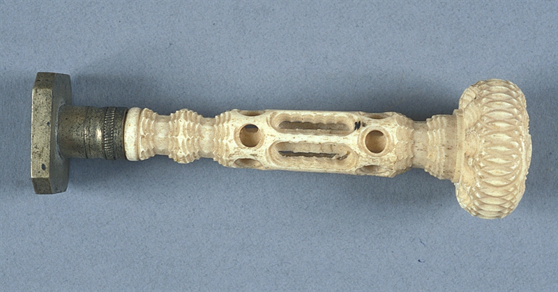 Manico in avorio inciso a colonna con decorazioni a traforo; sigillo a sezione ottagonale con stemma inciso.