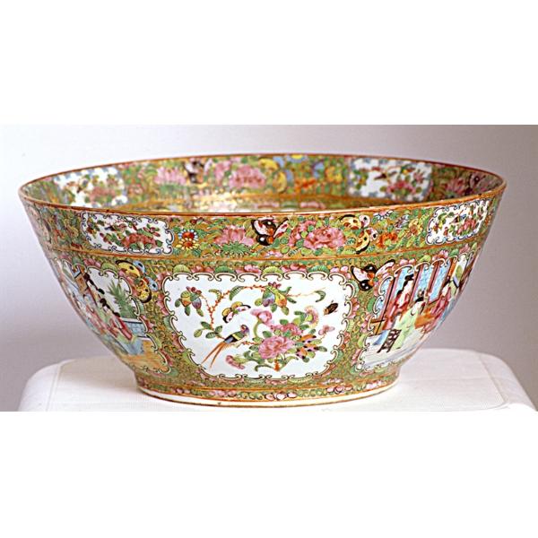 Coppa cinese con base a sezione circolare, corpo semiglobulare, dipinta con scene di vita di corte nei colori prevalenti di verde, celeste e rosa e rifinita in oro.