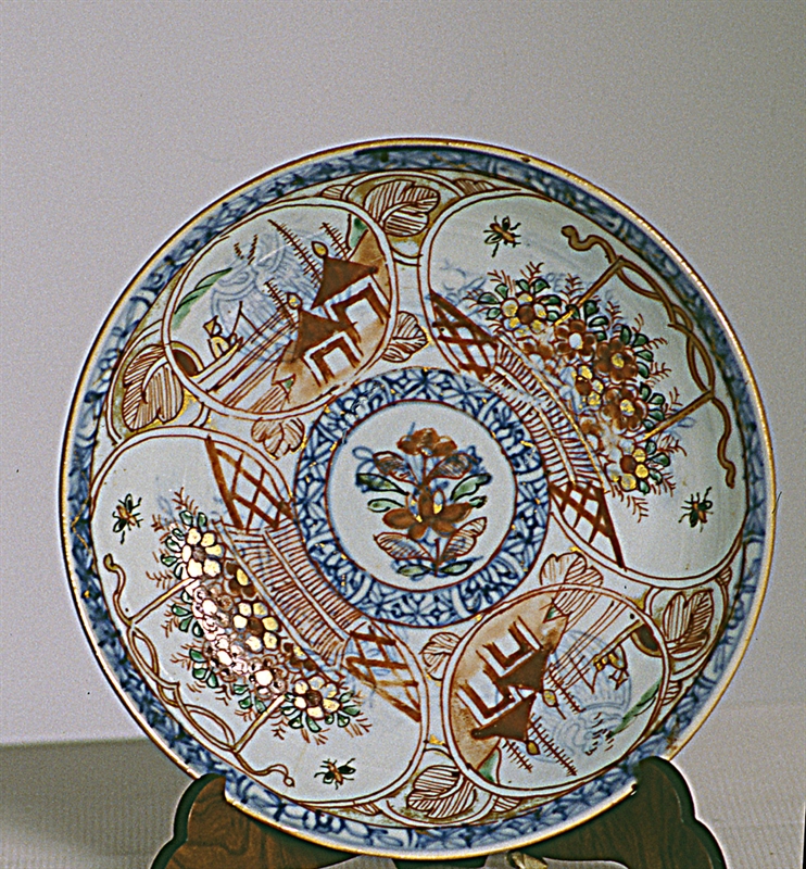 Piattino con tesa decorata a quattro partizioni raffiguranti rispettivamente costruzioni orientali e cesti di fiori, fondo a decoro floreale. Colori prevalenti arancio, blu, verde, finiture in oro.