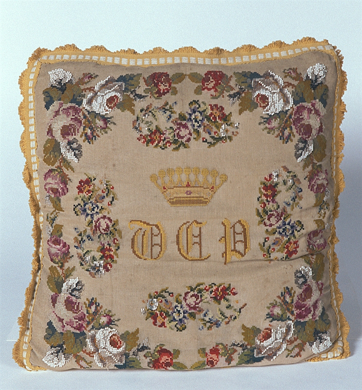 Cuscino quadrato ricamato sul fronte in lana policroma a mezzo punto con una cornice di rose e fiori contenente al centro le iniziali 'O C P' sovrastate da una corona marchionale.