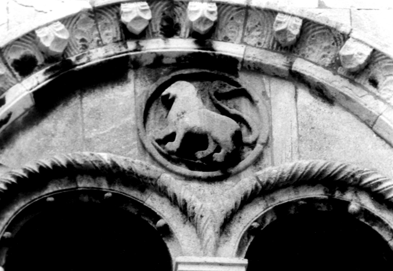 Rilievo decorativo di una bifora di facciata incorniciata da un motivo decorativo a foglie, leopardo centrale e sopra le due aperture costoloni a intreccio.
