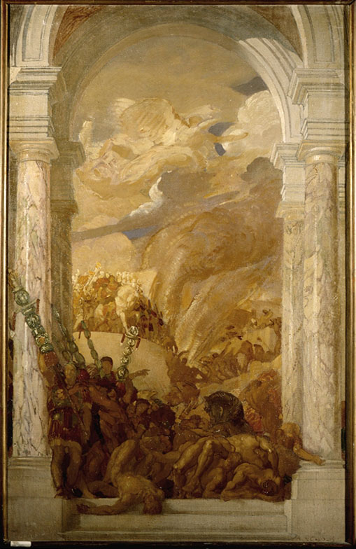 La scena, inserita in una cornice architettonica dipinta, si svolge in un ambiente naturale ed aperto, in una composizione spezzata tra primo piano e sfondo. Nel registro inferiore sono ammucchiati i corpi morti e ignudi dei Galli travolti dai Romani, mentre in secondo piano, oltre la sfilata dei legionari, ardono le mura della città. Sullo sfondo la concitazione della battaglia si dirada nel fumo dell’incendio che sale verso l’alto, dove si libra una figura alata.