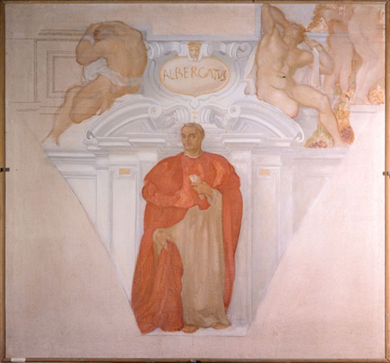 Il bozzetto raffigura, in posizione eretta, il Beato Niccolò Albergati: la mano sinistra stringe un cartiglio sul petto, mentre la destra regge un pesante mantello rosso.