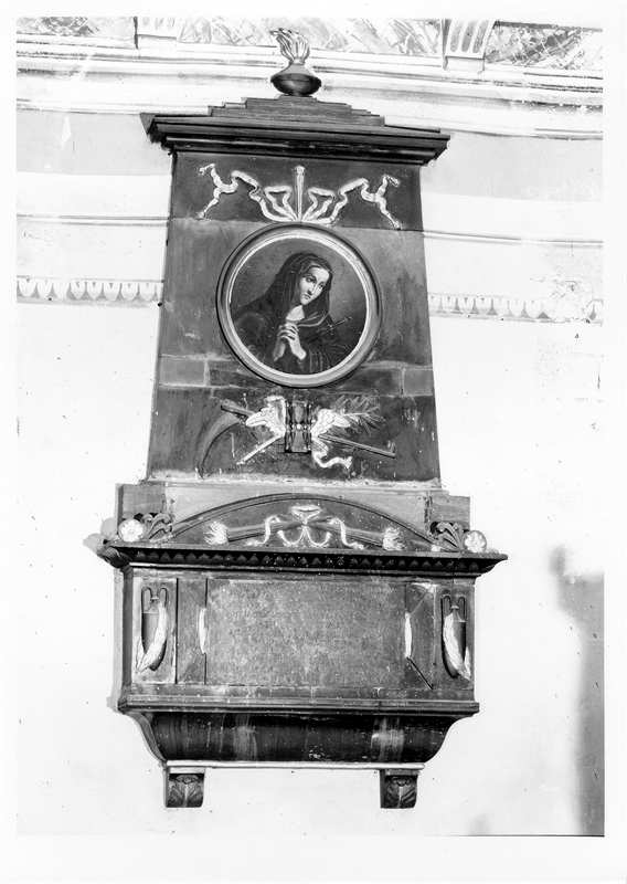 Sepolcro di forma rettangolare sormontato da stele decorata da clipeo con figura dell'Addolorata e simboli della morte.