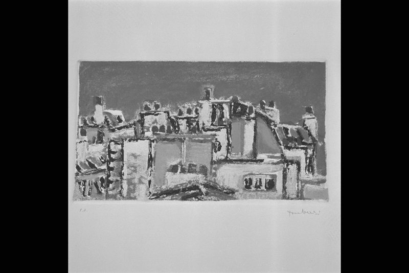 Tamburi Orfeo (1910/ 1994) , scorcio di città vista dall'alto con tetti, camini e nuvole
