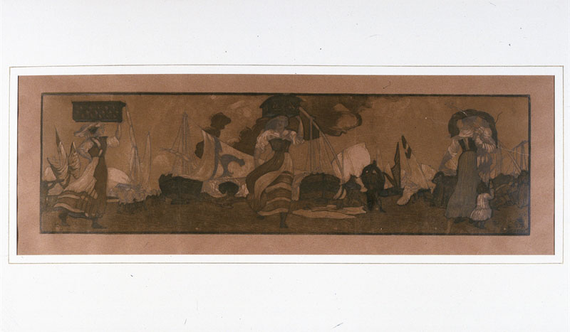 paesaggio marino; figure femminili; barche