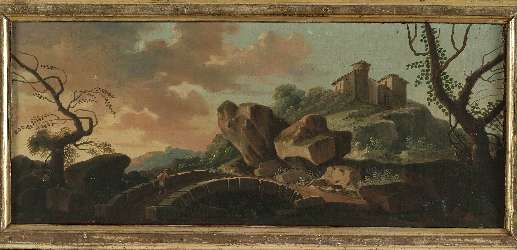 Sopraporta che raffigura un paesaggio con rocce fortemente chiaroscurate e stereotipate forme architettoniche di rocche e torri. Il taglio d’immagine sviluppato in diagonale, mai frontale, usato per accentuare il dinamismo della composizione.