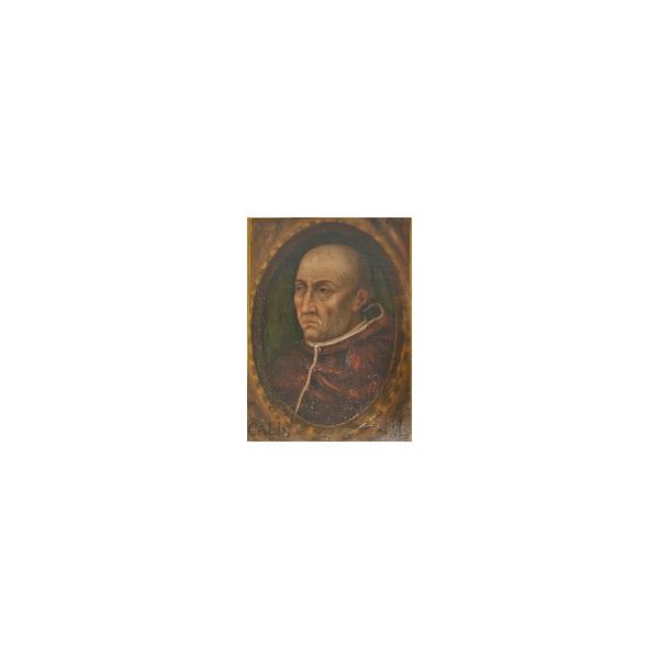Alonzo Borgia (Xàtiva, 1378 - Roma, 1458) fu eletto nel 1455 e prese il nome di Callisto III. Zio di Alessandro VI, combatté i Turchi ed Alfonso d'Aragona, re di Napoli. I tratti corrispondono a quelli del ritratto (Valencia, Museo della Cattedrale), dipinto da Joan de Joanes, che fa parte di una serie iconografica datata alla meta del ’500.