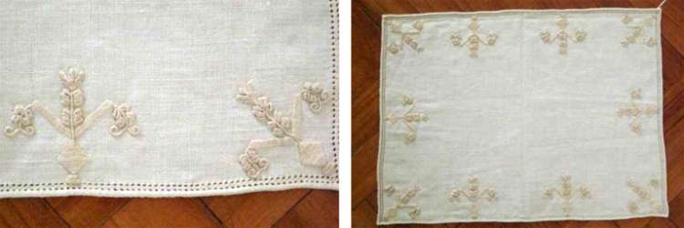 1 SOTTOPIATTO PER APPARECCHIATURA AMERICANA. Motivo: FLOREALE. TRE SPIGHE O GIGLI ENTRO VASO PANCIUTO RIPETUTE AL PERIMETRO CON IMPIANTO MODULARE Colore: GREGGIO. FONDO IN LINO, RICAMO IN COTONE. PUNTO QUADRO E “BIRELLO” ALL’ORLO. TELA TESSUTA A MANO DA “TELA UMBRA” - CITTA’ DI CASTELLO. RICAMO A MANO.