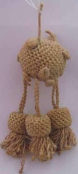 2 pezzi; Motivo: TESTA A SFERA, TRE PENDENTI CON CILINDRETTI E FRANGE ANNODATE Colore: MARRONE Punti usati: MERLETTO AD AGO Tipo di Fondo: FILO DI COTONE MARRONE TINTURA MANUALE.