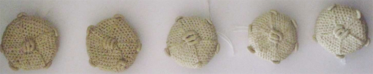 5 pezzi. Colore: MARRONE Punti usati: MERLETTO AD AGO Tipo di Fondo: FILO DI COTONE MARRONE TINTURA MANUALE.