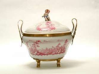 Zuppiera in porcellana con montatura in ottone con manici in foglia, piedi taurini, il coperchio ha in cima la statuina di un Putto. La zuppiera è decorata su due lati con paesaggi color porpora così come il coperchio. Il putto è dipinto in color carne ed è coperto con un panno blu. Pezzo del servizio da tavola Ginori.