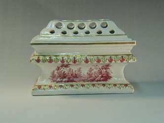 Caisse à fleurs in porcellana decorata con paesaggi porpora con coperchio a fori tondi di diversa grandezza per infilare i fiori. Rifiniture dorate. Pezzo del servizio da tavola Ginori.