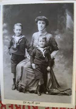 Ritratto a figura intera di Romeyne Robert Ranieri Bourbon di Sorbello (1878-1951), moglie di Ruggero Ranieri VI Bourbon di Sorbello, con i figli Giannantonio e Uguccione; foto in bianco e nero con riquadro bianco su su compare (in basso) la data 20 aprile 1910 scritta in corsivo.
