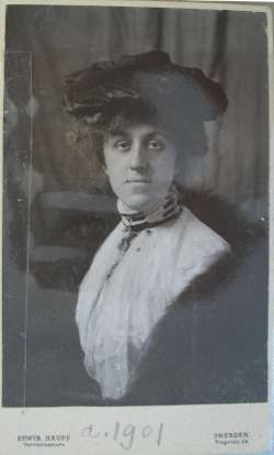 Ritratto a mezzo busto di Romeyne Robert Ranieri Bourbon di Sorbello (1878-1951), moglie di Ruggero Ranieri VI Bourbon di Sorbello; fotografia scattata durante un viaggio (in occasione del fidanzamento con Ruggero IV o del matrimonio); foto in bianco e nero con riquadro bianco su cui compaiono in basso nome e indirizzo del fotografo e a matita la scritta "a. 1901".