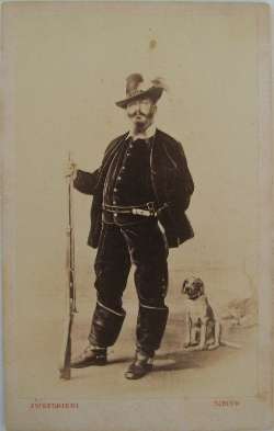 Ritratto di Vittorio Emanuele II Re d'Italia; in questa immagine è ritratto in tenuta da caccia; foto color seppia su riquadro bianco, marchio del fotografo in basso.
