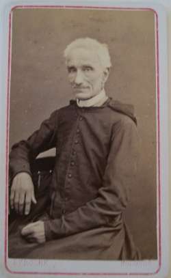 Ritratto di Vincenzo Gioacchino Raffaele Luigi Pecci (Carpineto Romano, 2 marzo 1810 – Roma, 20 luglio 1903), futuro Papa Leone XIII; immagine color seppia su riquadro bianco, in basso il marchio del fotografo.