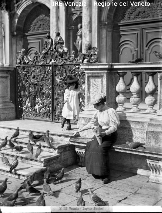 Venezia - Loggetta Sansovino - Una ragazza e una bambina (due figlie di Filippi?) danno da mangiare ai piccioni