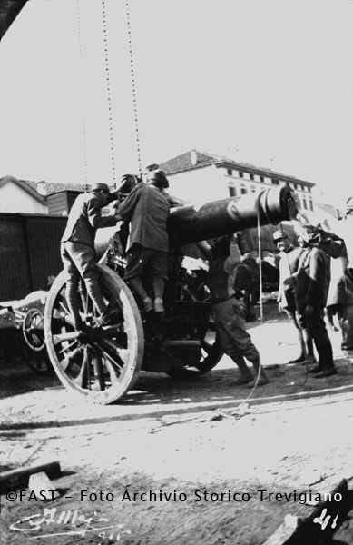 Soldati montano un pezzo d'artiglieria con l'ausilio di una gru