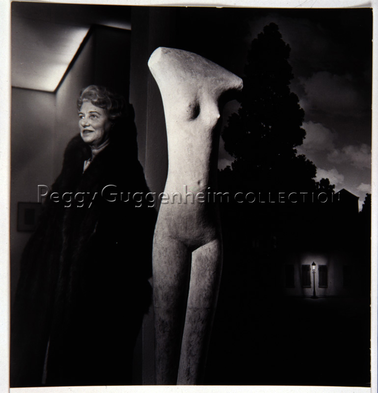 Peggy Guggenheim accanto al gesso di Giacometti, "Donna che cammina", e al dipinto di Magritte, "L'impero della luce", alla Tate Gallery, nel 1964
