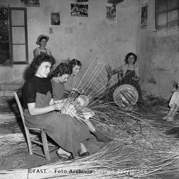 Donne che intrecciano cesti in vimini