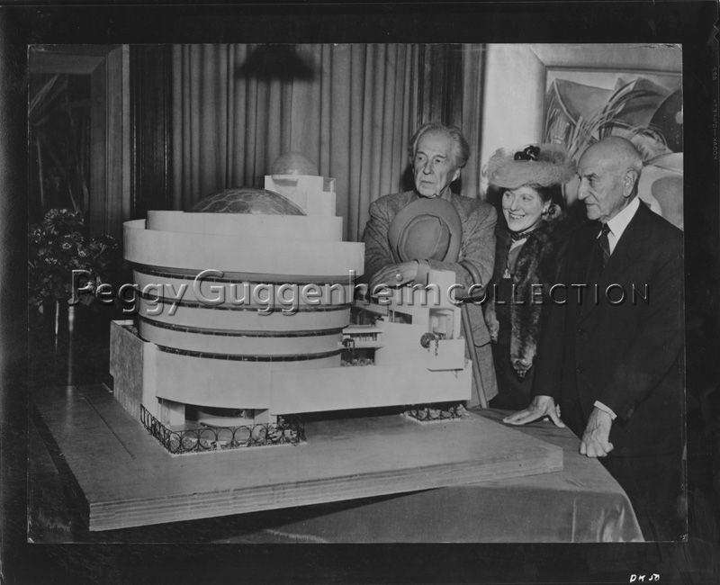 Frank Lloyd Wright, Hilla Rebay and Solomon R. Guggenheim viewing Guggenheim Museum model, New York, 1945.
