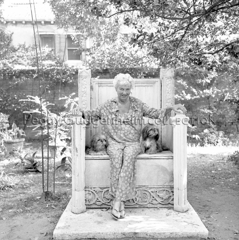 Peggy Guggenheim sul trono nel giardino di Palazzo Venier dei Leoni; a sinistra Takis, "Segnale" (1958, PGC); Venezia, 1970