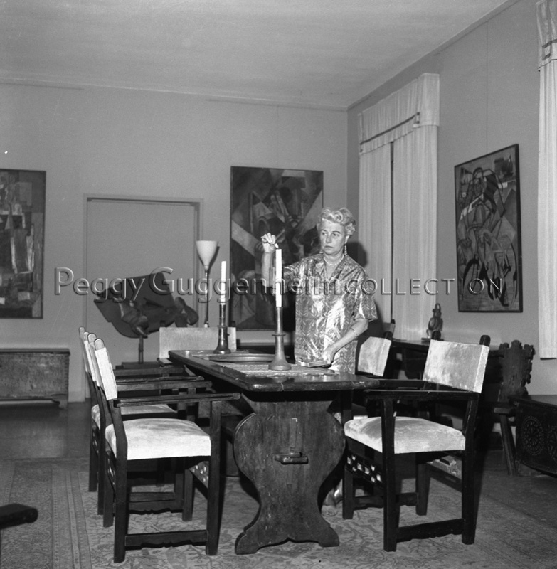Peggy Guggenheim nella sala da pranzo di Palazzo Venier dei Leoni; alle sue spalle (da sinistra a destra) Umberto Boccioni, "Dinamismo di un cavallo in corsa + case" (1914-15, PGC), Albert Gleizes, "Donna con animali (Madame Raymond Duchamp-Villon)" (1914, PGC), e Jean Metzinger, "Al velodromo" (1912, PGC); Venezia, primi anni '60
