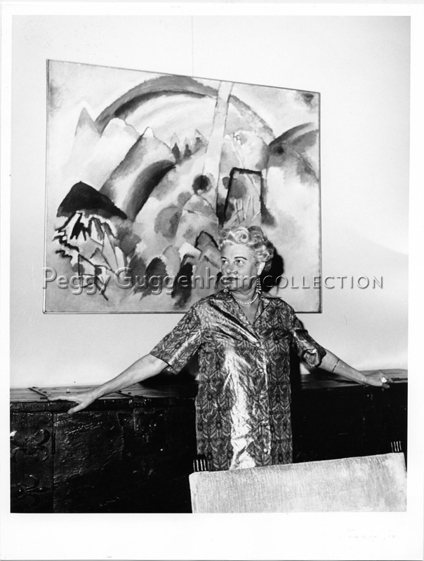Peggy Guggenheim nella sala da pranzo di Palazzo Venier dei Leoni; alle sue spalle Vasilij Kandinskij, "Paesaggio con macchie rosse, n. 2" (1913, PGC); Venezia, primi anni '60