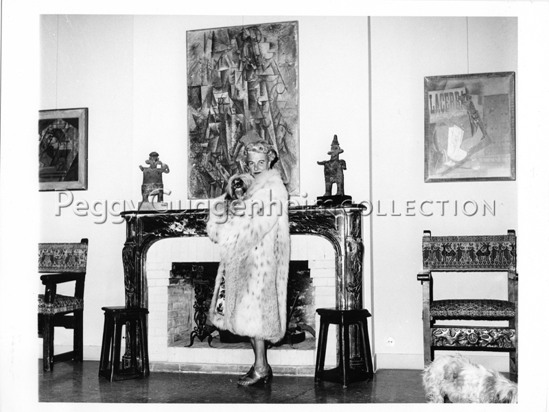 Peggy Guggenheim a Palazzo Venier dei Leoni; sulla parete (da sinistra a destra) Juan Gris, "Bottiglia di rum e giornale" (1914, PGC), Pablo Picasso, "Il poeta" (1911, PGC) e "Pipa, bicchiere, bottiglia di Vieux Marc" (1914, PGC); Venezia, 1973