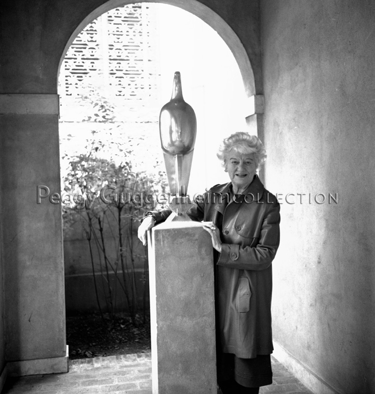 Peggy Guggenheim nella barchessa di Palazzo Venier dei Leoni accanto a Constantin Brancusi, "Maiastra" (1912, PGC); Venezia, 1973