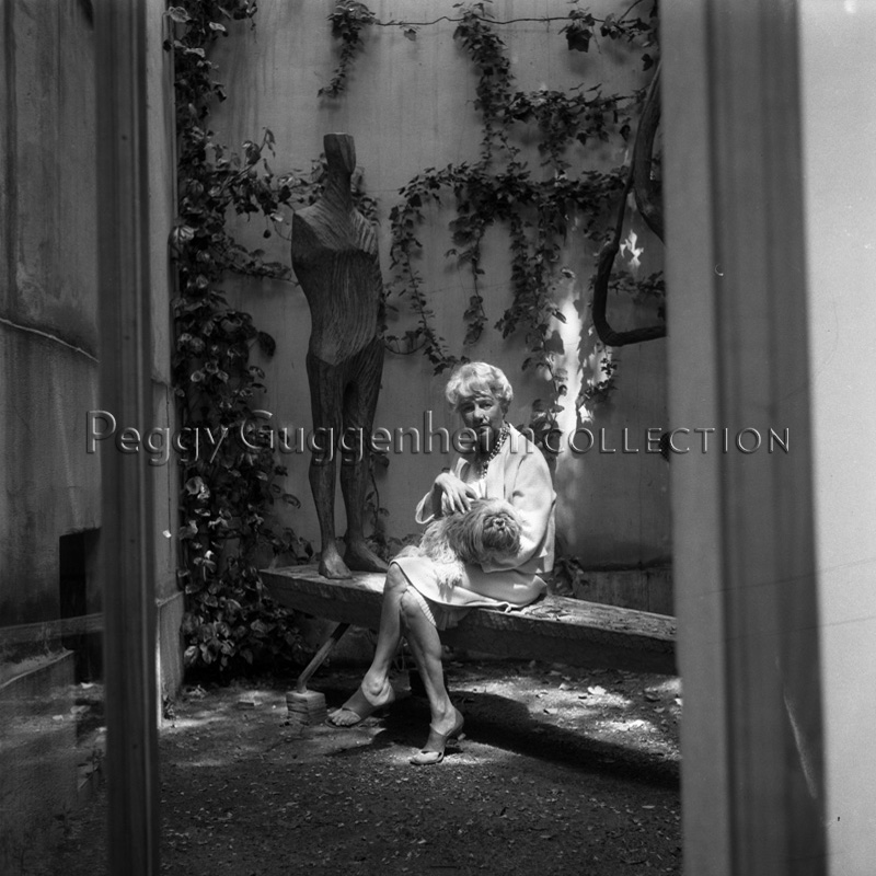 Peggy Guggenheim a Palazzo Venier dei Leoni seduta sulla scultura di Tomonori Toyofuku, ?Deriva n. 2? (1959, PGC); Venezia, 1973