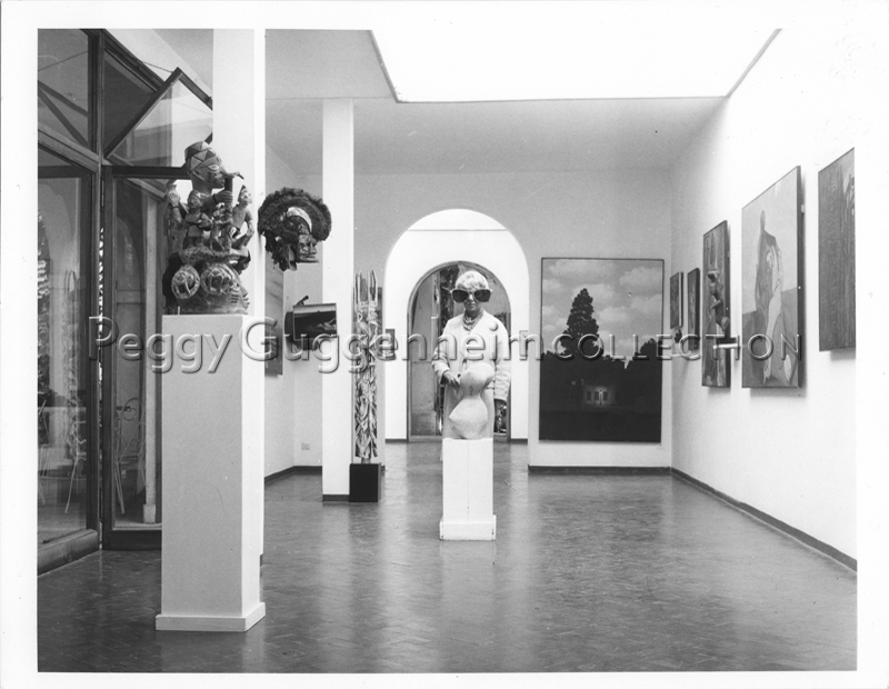 Peggy Guggenheim nella barchessa di Palazzo Venier dei Leoni dietro a Jean Arp, "Corona di germogli I" (1936, PGC); nella parete di fondo René Magritte, "L'impero della luce" (1953-54, PGC); Venezia, 1973