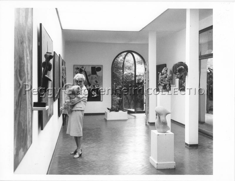 Peggy Guggenheim nella barchessa di Palazzo Venier dei Leoni; a destra Jean Arp, "Corona di germogli I" (1936, PGC); sullo sfondo Alberto Giacometti, "Donna sgozzata" (1932, PGC), e Joan Miró, "Donna seduta II" (1939, PGC); Venezia, 1973