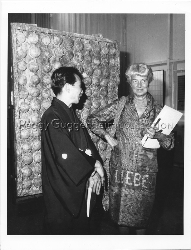 Tomonori Toyofuku e Peggy Guggenheim (da sinistra a destra) durante un'esposizione delle opere dell'artista giapponese; anni '60.