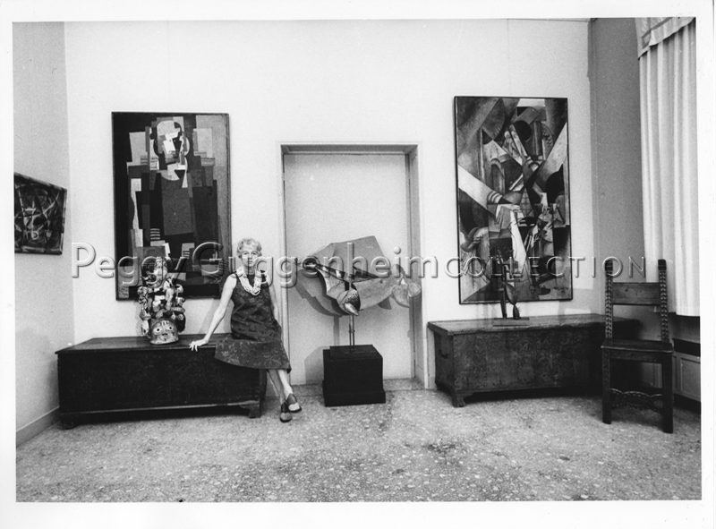 Peggy Guggenheim nella sala da pranzo di Palazzo Venier dei Leoni; alle sue spalle (da sinistra a destra) Giacomo Balla, "Velocità astratta + rumore" (1913-14, PGC), Louis Marcoussis, "L'Habitué" (1920, PGC), una maschera della sua collezione di sculture africane, Umberto Boccioni, "Dinamismo di un cavallo in corsa + case" (1914-15, PGC), Albert Gleizes, "Donna con animali (Madame Raymond Duchamp-Villon)" (1914, PGC), Julio González, "L'uomo cactus I" (1939, PGC); Venezia, 1962