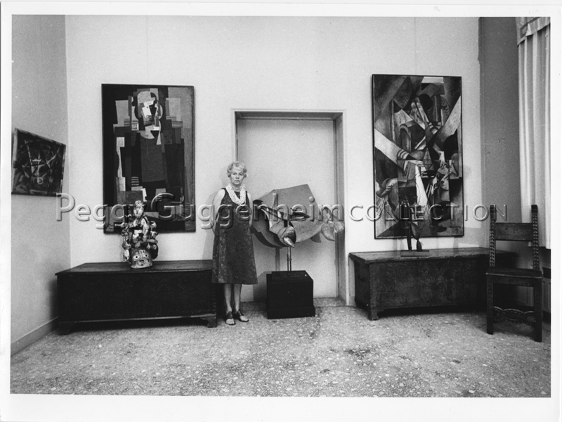 Peggy Guggenheim nella sala da pranzo di Palazzo Venier dei Leoni; alle sue spalle (da sinistra a destra) Giacomo Balla, "Velocità astratta + rumore" (1913-14, PGC), Louis Marcoussis, "L'Habitué" (1920, PGC), una maschera della sua collezione di sculture africane, Umberto Boccioni, "Dinamismo di un cavallo in corsa + case" (1914-15, PGC), Albert Gleizes, "Donna con animali (Madame Raymond Duchamp-Villon)" (1914, PGC), Julio González, "L'uomo cactus I" (1939, PGC); Venezia, 1962